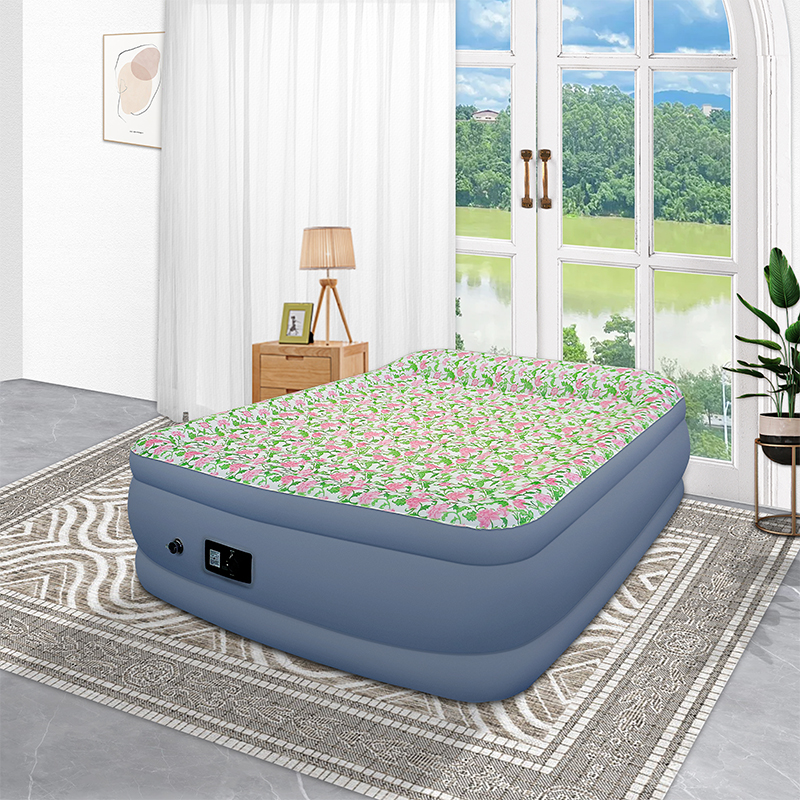 This flocked air mattress, with a soft pink floral and green leaf pattern on the top surface, is designed for both indoor and outdoor environments. Reminiscent of a spring garden, it is peaceful and relaxing, adding a touch of elegance to any setting. With its fast inflating ability and portability, this air mattress makes it easy to transition seamlessly from a comfortable night indoors to an adventurous outdoor trip with ease and ease of use.